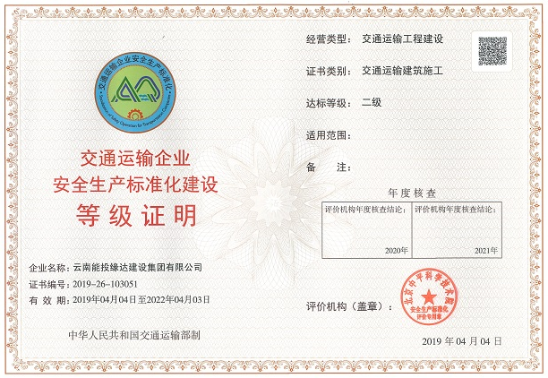 缘达建设公司取得交通运输企业安全生产标准化二级证书